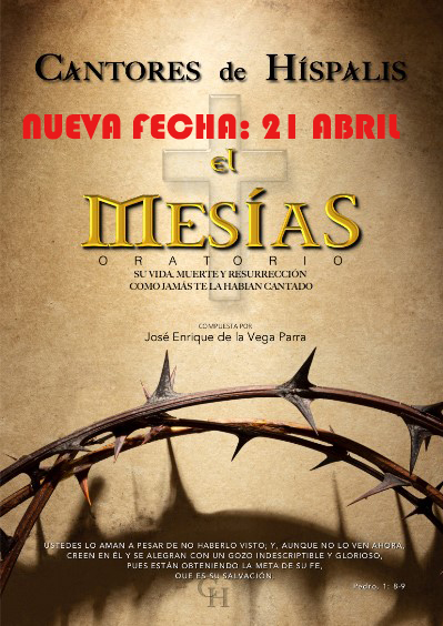 Fulcro Producciones comunicó que la representación de la obra “EL MESIAS” de Cantores de Híspalis que estaba prevista para el pasado domingo 26 de marzo quedaba aplazada y se trasladaba al viernes 21 de abril a las 21:00h