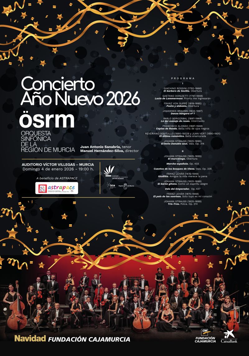 Para dar la bienvenida al año, contaremos con el tradicional Concierto de Año Nuevo a cargo de la Orquesta Sinfónica de la Región de Murcia que interpretará un programa especial, festivo y familiar.