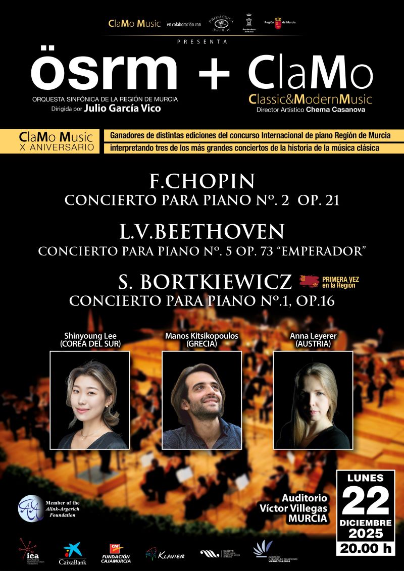 Los protagonistas son tres pianistas que ya forman parte de la historia de ClaMo Music como ganadores del Primer Premio del Concurso Internacional de Piano ClaMo Región de Murcia: Shinyoung Lee (Corea del Sur) Interpretará el Concierto para piano n.º 2 Op. 21 de F.Chopin, Manos Kitsikopoulos (Grecia) Brillará con el majestuoso Concierto para piano n.º 5 Op. 73 “Emperador” de Beethoven y Anna Leyerer (Austria) Protagonizará un momento histórico con el Concierto para piano n.º 1 de Sergei Bortkiewicz, que se escuchará por primera vez con orquesta sinfónica en España, una partitura arrebatadora y llena de emoción.